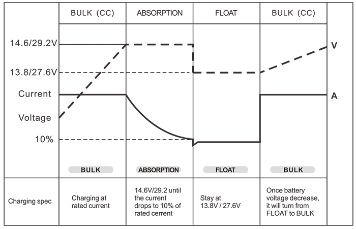 ব্যাটারি নিয়ন্ত্রণ (3-পর্যায়ের ব্যাটারি চার্জার) বাল্ক/শোষণ/ফ্লোট