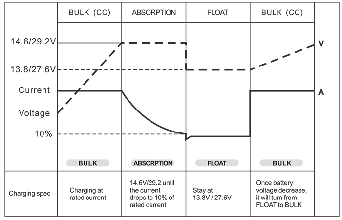 ব্যাটারি নিয়ন্ত্রণ (3-পর্যায়ের ব্যাটারি চার্জার) বাল্ক/শোষণ/ফ্লোট